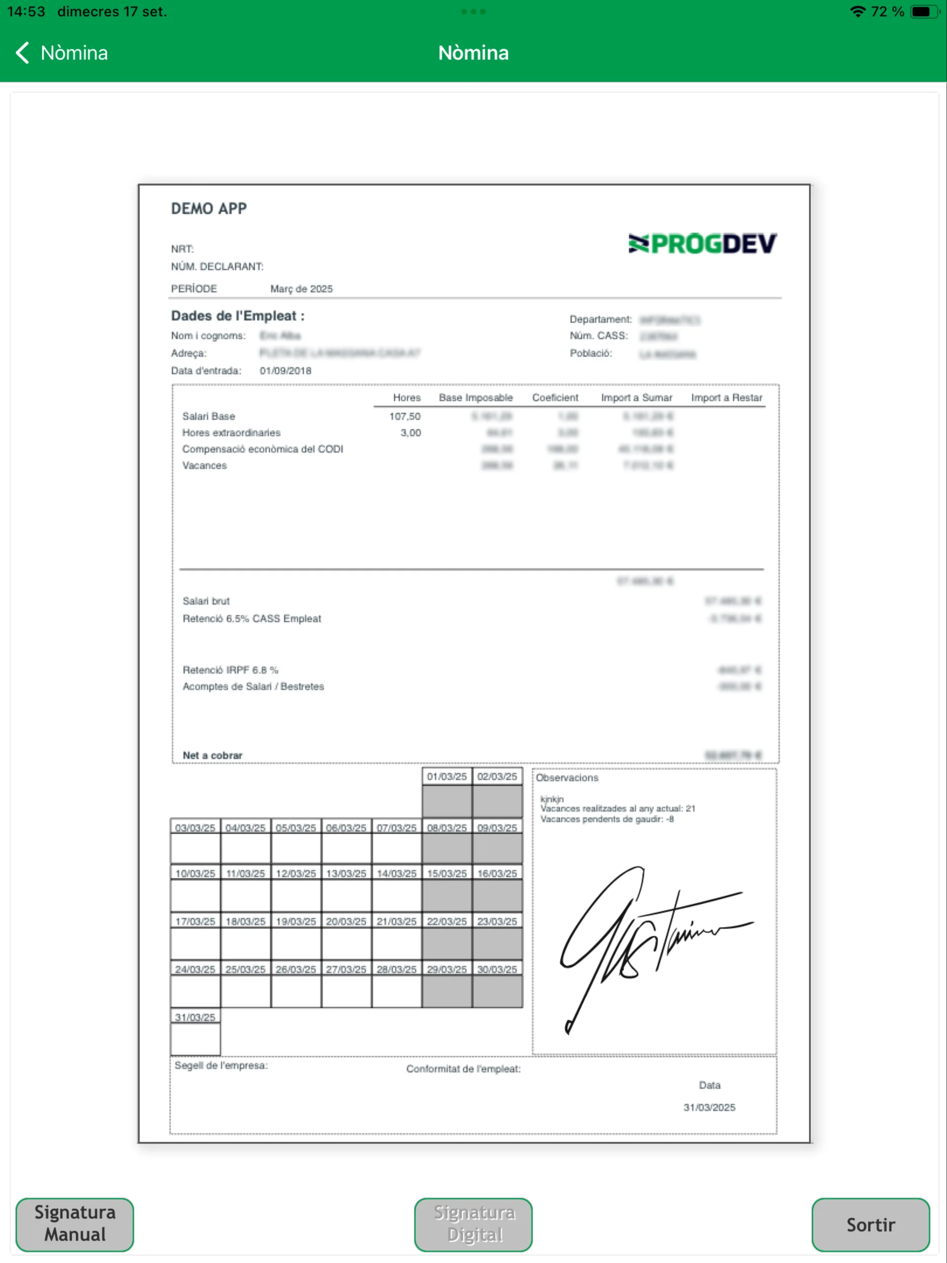 Sí. El sistema permet enviar els butlletins salarials perquè els empleats els signin digitalment des del mòbil, amb registre de traçabilitat.