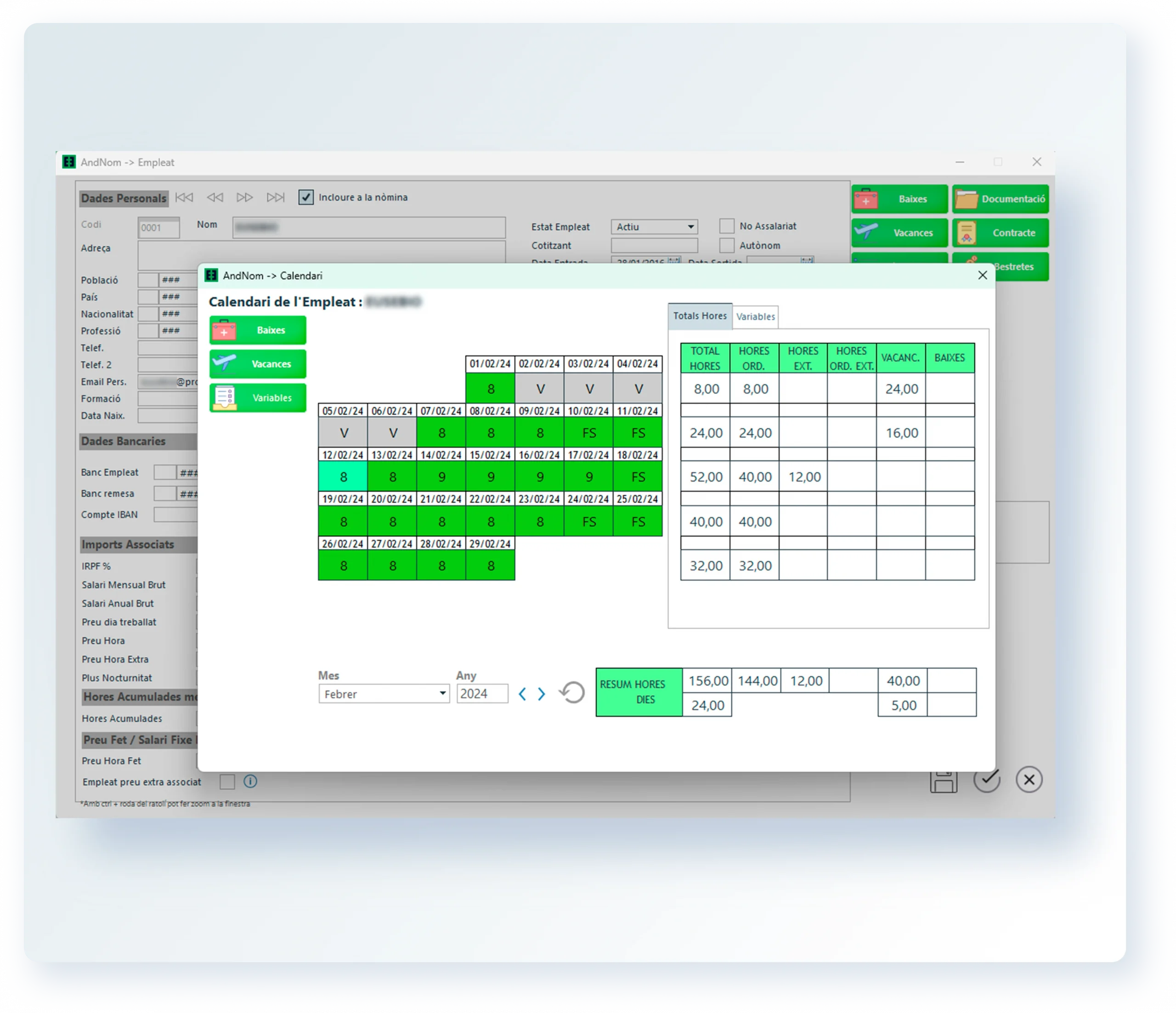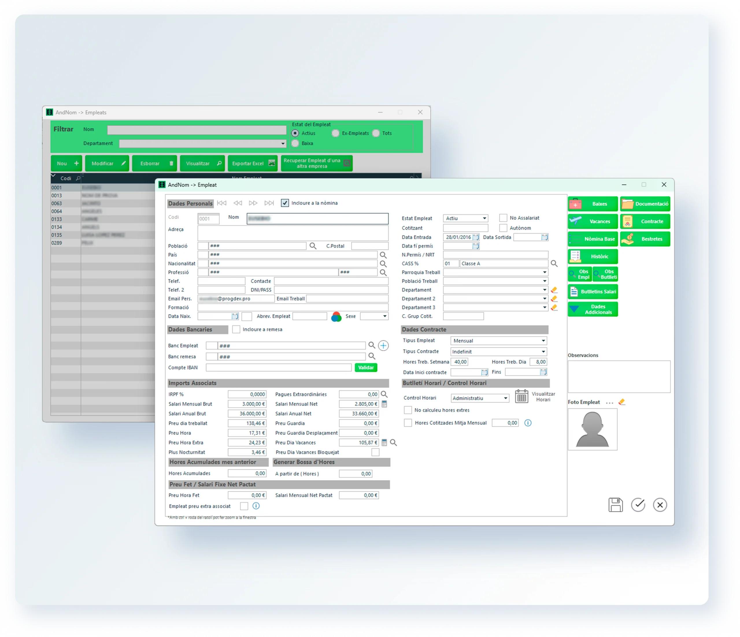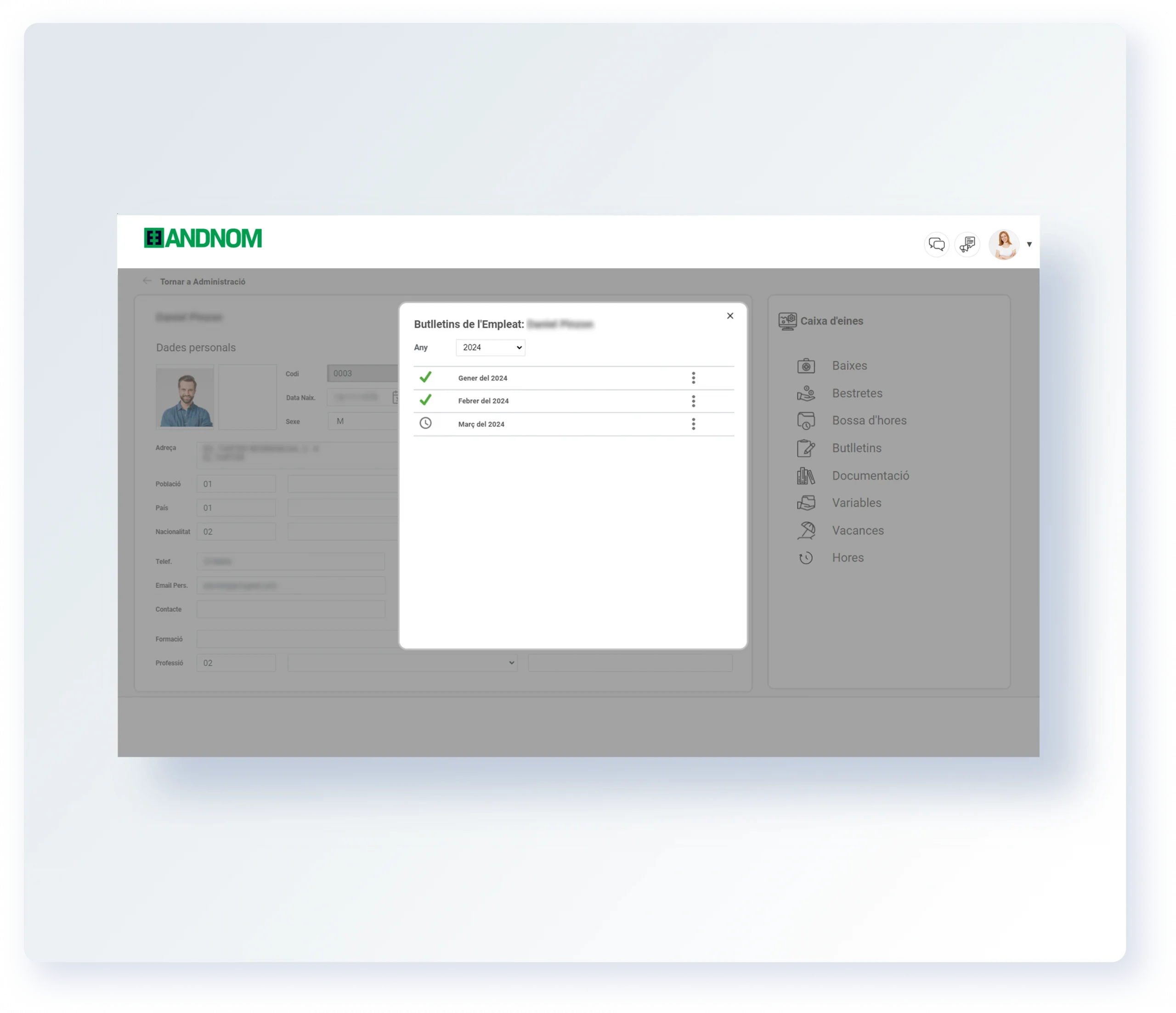 AndNom automatitza el càlcul de nòmines, les variables salarials, la generació de remeses bancàries i la gestió de vacances, baixes i hores treballades.