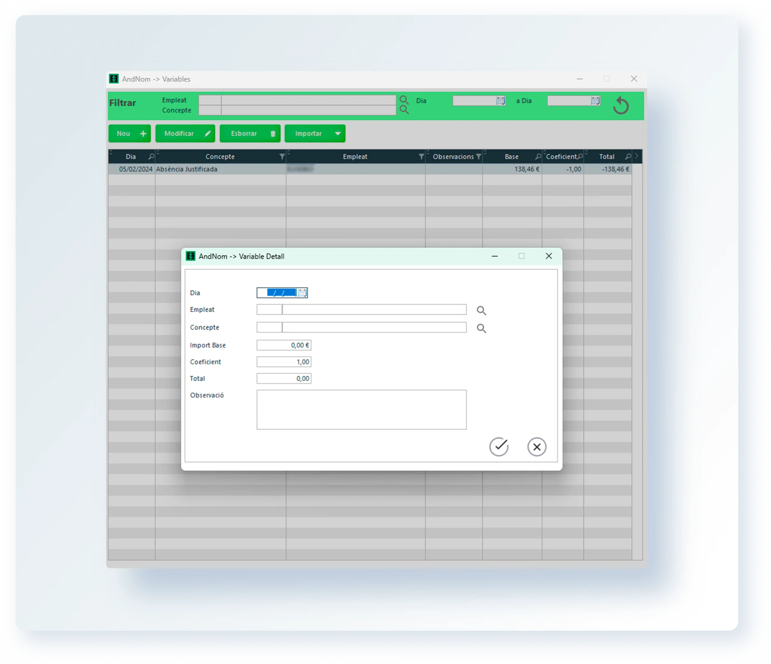 Amb AndNom, tens la capacitat de crear nòmines amb conceptes fixes. Permet incloure elements salarials constants en cada càlcul, com ara el sou base o les bonificacions regulars. Permet gestionar aquests conceptes fixes de manera eficient per assegurar la precisió en cada nòmina.