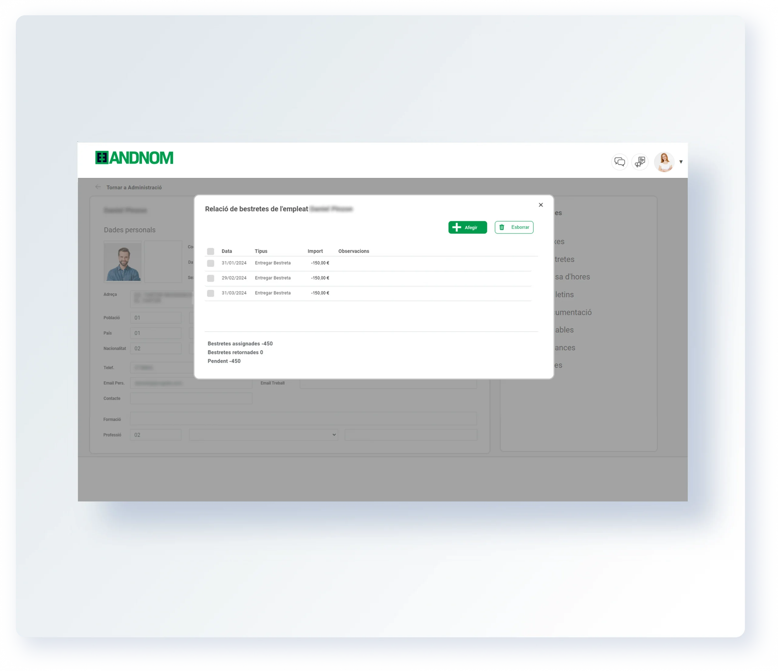 AndNom ofereix una funcionalitat eficient per a la gestió de bestretes, permetent registrar i controlar de manera precisa i transparent, simplificant els processos de liquidació.