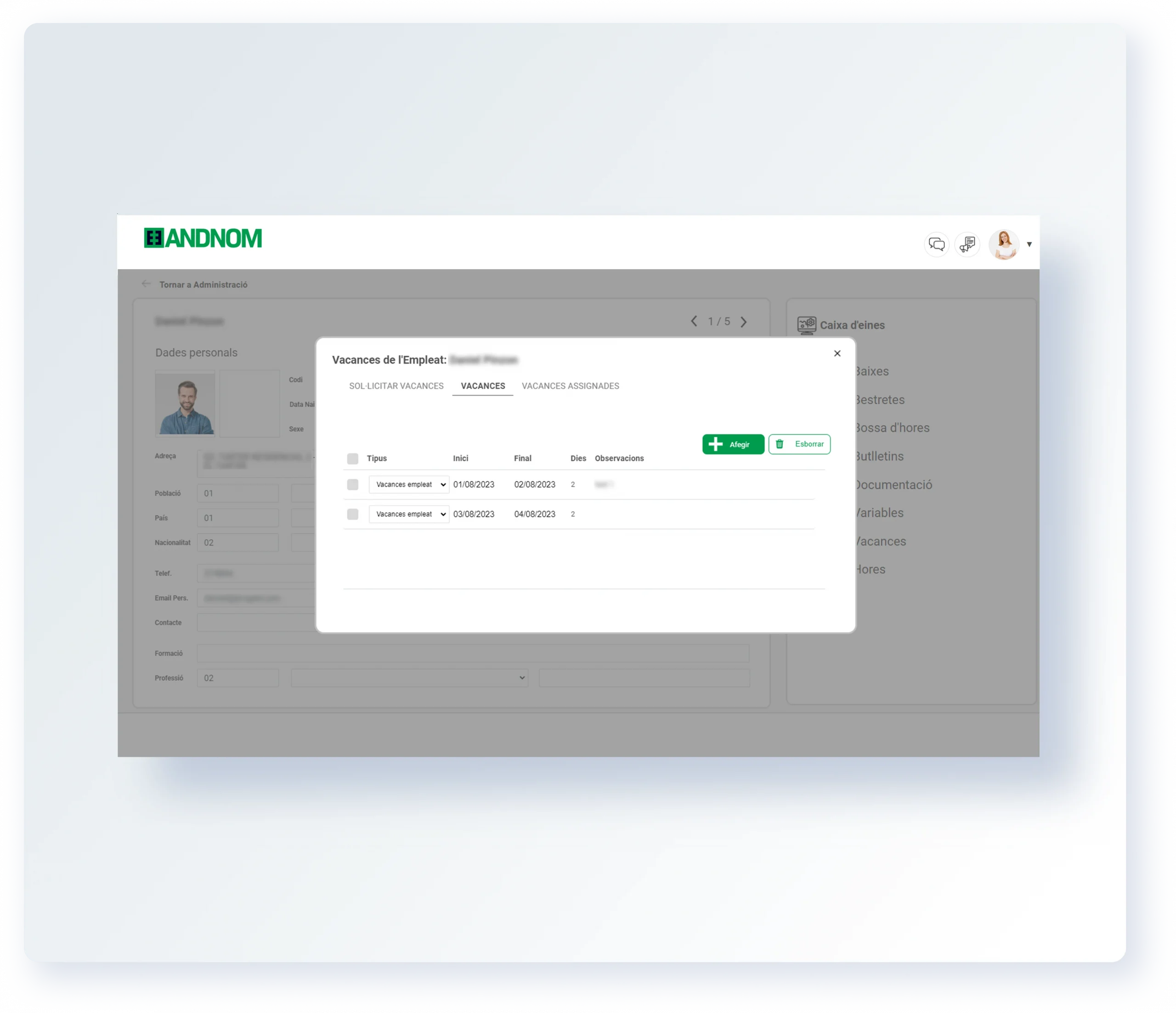 AndNom ofereix una plataforma integrada per gestionar les vacances dels empleats, facilitant el seguiment, sol·licitud d’absències, tot garantint el compliment de les polítiques de l’empresa i les regulacions laborals.