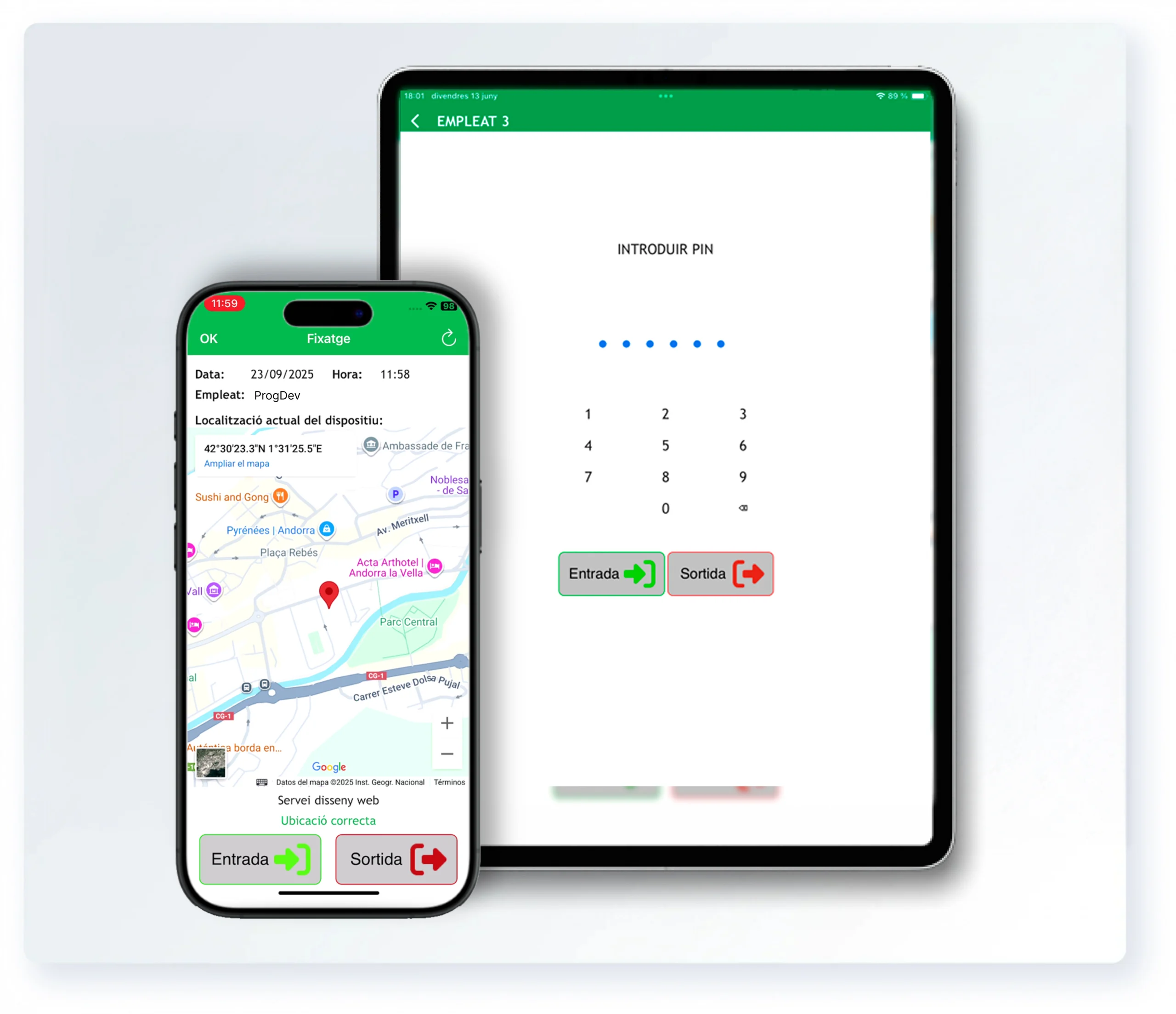El mòdul de Fitxatge d’AndNom permet als empleats fitxar des del mòbil amb GPS o des de punts fixos, registrant les entrades i sortides de forma fàcil.