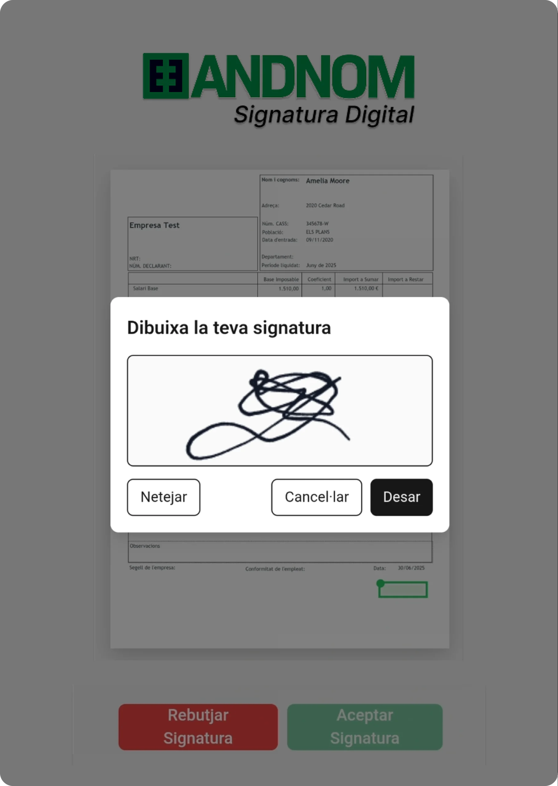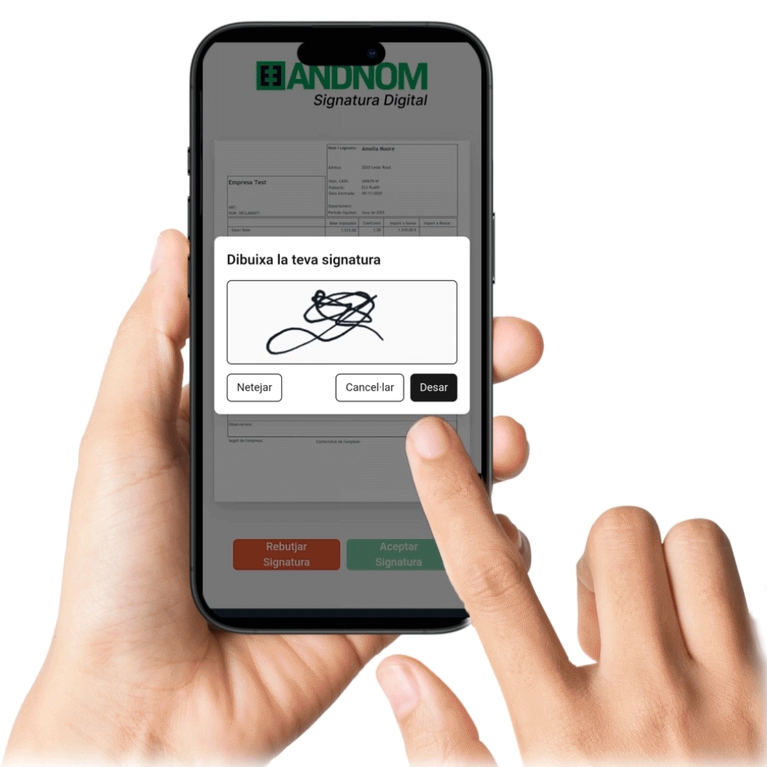La demo et permet provar el procés complet: rebre la nòmina per correu, accedir a l’enllaç, signar digitalment i veure com queda registrada a AndNom. també et podem ensenyar qualsevol altra caracteristica i funció d'AndNom que t'interessi.